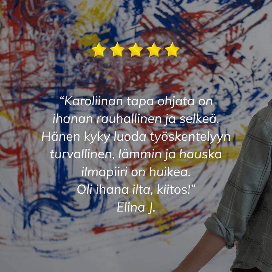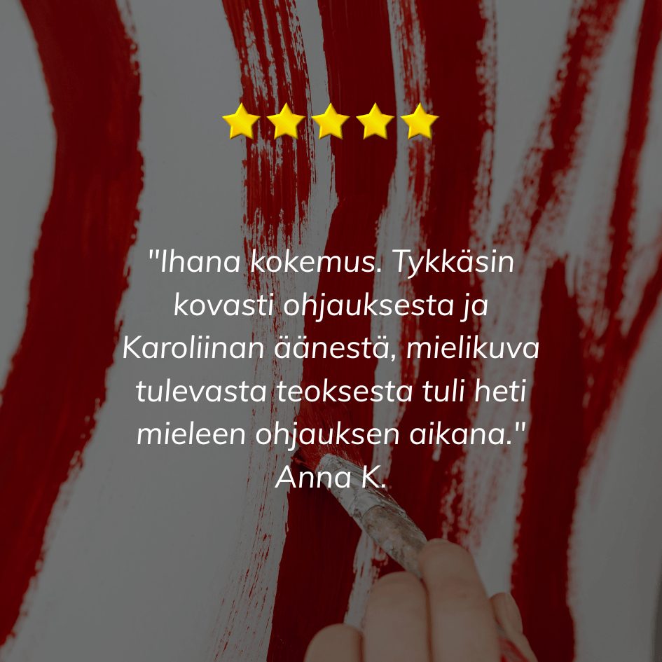 Olen Karoliina Kosmaa, kuvataideterapeutti ja työnohjaaja sekä IHAN PIMEETÄ® -elämyksen kehittäjä ja ohjaaja. IHAN PIMEETÄ ei ole taideopetusta, vaan turvallisesti ohjattu luova elämys. Osallistuminen on helppoa, suorittaminen jää sivuun ja jokainen voi olla mukana omalla tavallaan.