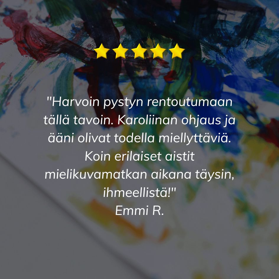 Lyhyt rentoutus ja mielikuvamatka johdattavat luovaan työskentelyyn. Ohjaajan lähestymistapa auttaa osallistujia siirtymään arjen kiireestä rauhallisempaan tilaan, jossa mielikuvitus ja omat havainnot voivat nousta esiin.