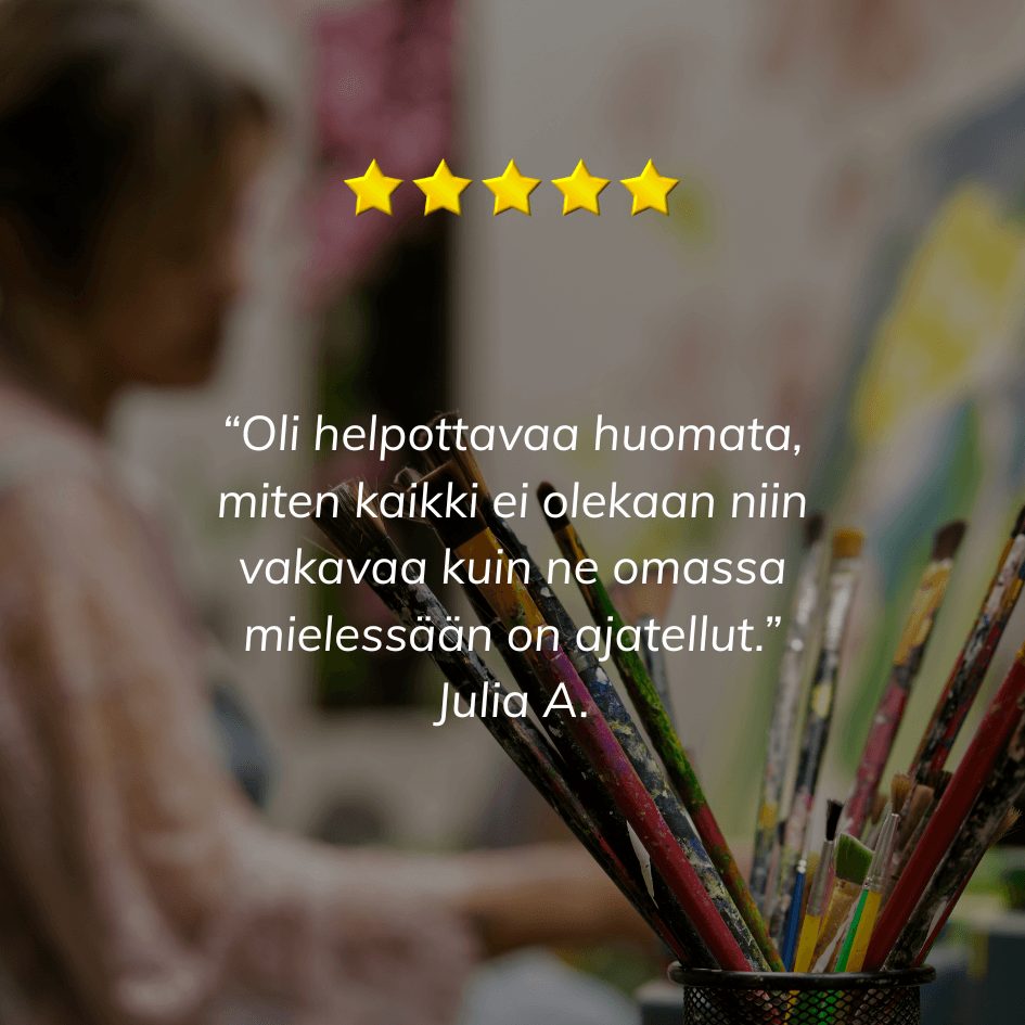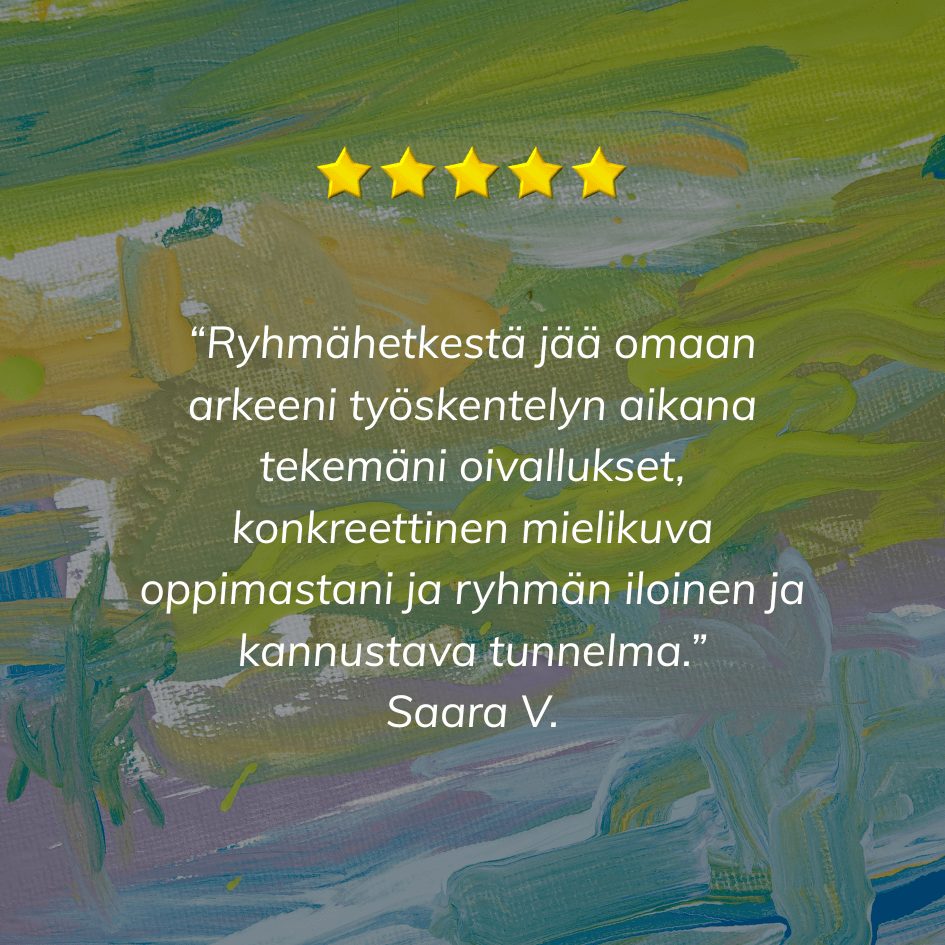 Ohjauksessa yhdistyy kuvataideterapeutti-työnohjaajan ymmärrys erilaisista ryhmistä ja luovan työskentelyn vapauttavasta vaikutuksesta.